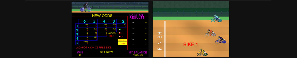 Bicycle Race is a bicycle racing game. Betting on the 2 fastest 1st and 2nd bicyclists to win .It has a jackpot feature that appears randomly to gives 3, 4 and 5 multipliers.