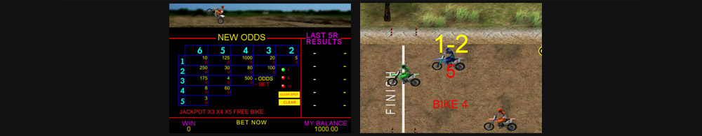 Dirt Bike is a bike racing game. Betting on the 2 fastest 1st and 2nd bikers to win .It has a jackpot feature that appears randomly to gives 3, 4 and 5 multipliers.