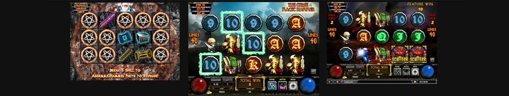The Curse of the Magic Hammer is a 5-reel, 40-lines slot game with Expanding Wild, The Expanding Wild will only appears on reel 2 and 4 during Free Game Feature, which will makes all the winnings multiplied by 3. There are 3 Jackpots to be won, which are Great Hammer, Mighty Hammer and Holy Hammer. Its symbols will appear as 5 Hammer parts which will appear randomly during the free spin.