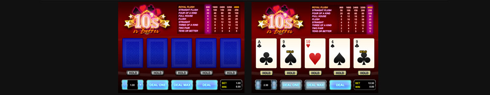 10’s or Better is a five-card video poker game. The different card combinations give different payouts. The minimum paying hand is a pair of tens. There is double up gamble option for every win to maximize the payout.