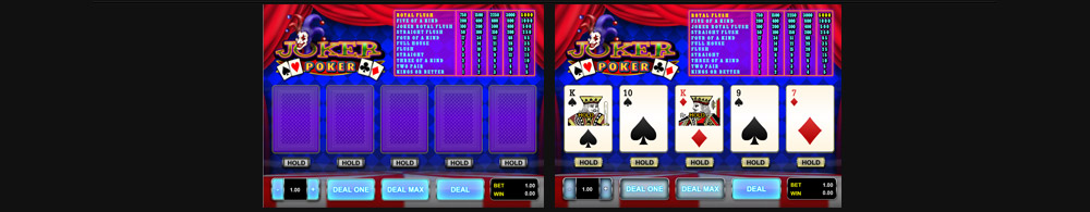 Joker Poker is a five-card video poker game. The different card combinations give different payouts. The minimum paying hand is a pair of Kings. There is double up gamble option for every win to maximize the payout. Joker wilds card substitute any other cards in this game. Discard unwanted card to get new cards by un-holding cards.